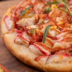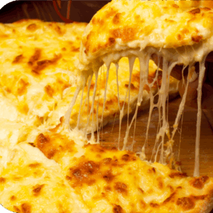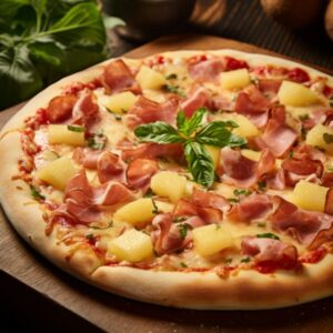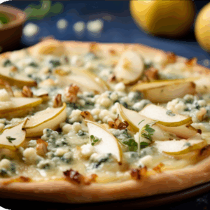 Salsa pomodoro, queso mozarella, de cabra, queso provolone, trozos de tocino, pera y manzana